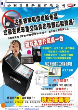 網路型食品標示機,單機也可使用 自動對應出有效日期.製造日及七大營養標示 可連接磅秤,產生條碼做進出貨管理及系統整合 可連續列印或自動剝離標籤功能 特徵 圖表L