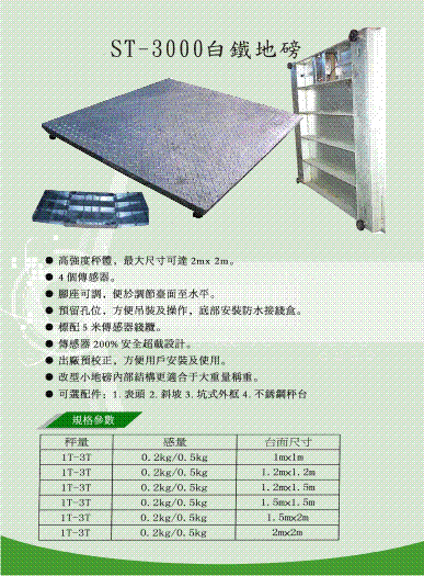 電子小地磅:顧名思義就是全電子非機械之地磅結構 白鐵小地磅:全機身以白鐵不鏽鋼燒焊而成 單層小地磅:適用於(單向)雙向坡道之台面 超薄型小地磅:以目前的技術可以做到離地5公釐=0.5CM 雙層小地磅:適用於堆高機或經常有機具撞擊之環境(耐用性最高)不過還是小心使用為上策